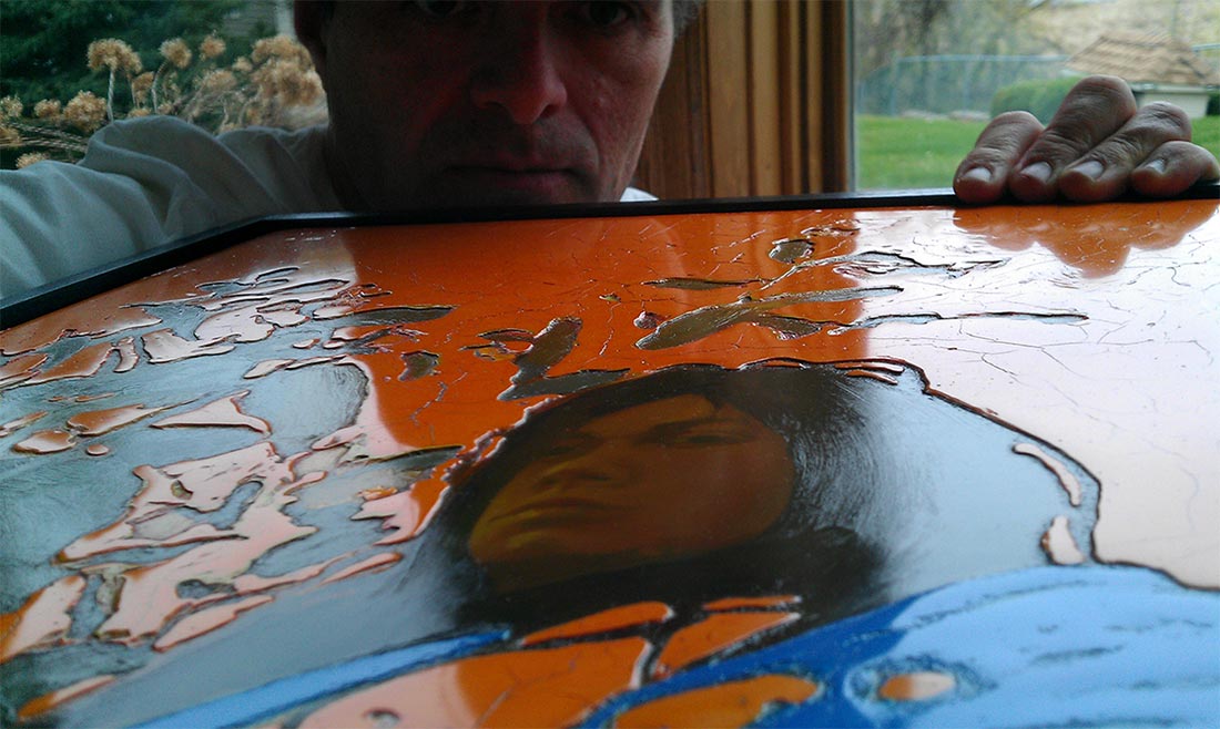 Known as a botanical artist Kevan F Willington’s recent work is so tactile it needs to be witnessed in person. These new works have a dimensional quality. The skies or what is known as the negative space in these pieces have a raised polished cracked stone like surface that is one eighth to a quarter inch higher than the subjects in the paintings. It has been said they resemble large ceramic tiles. This polished oil technique gives his work an ancient but contemporary look.